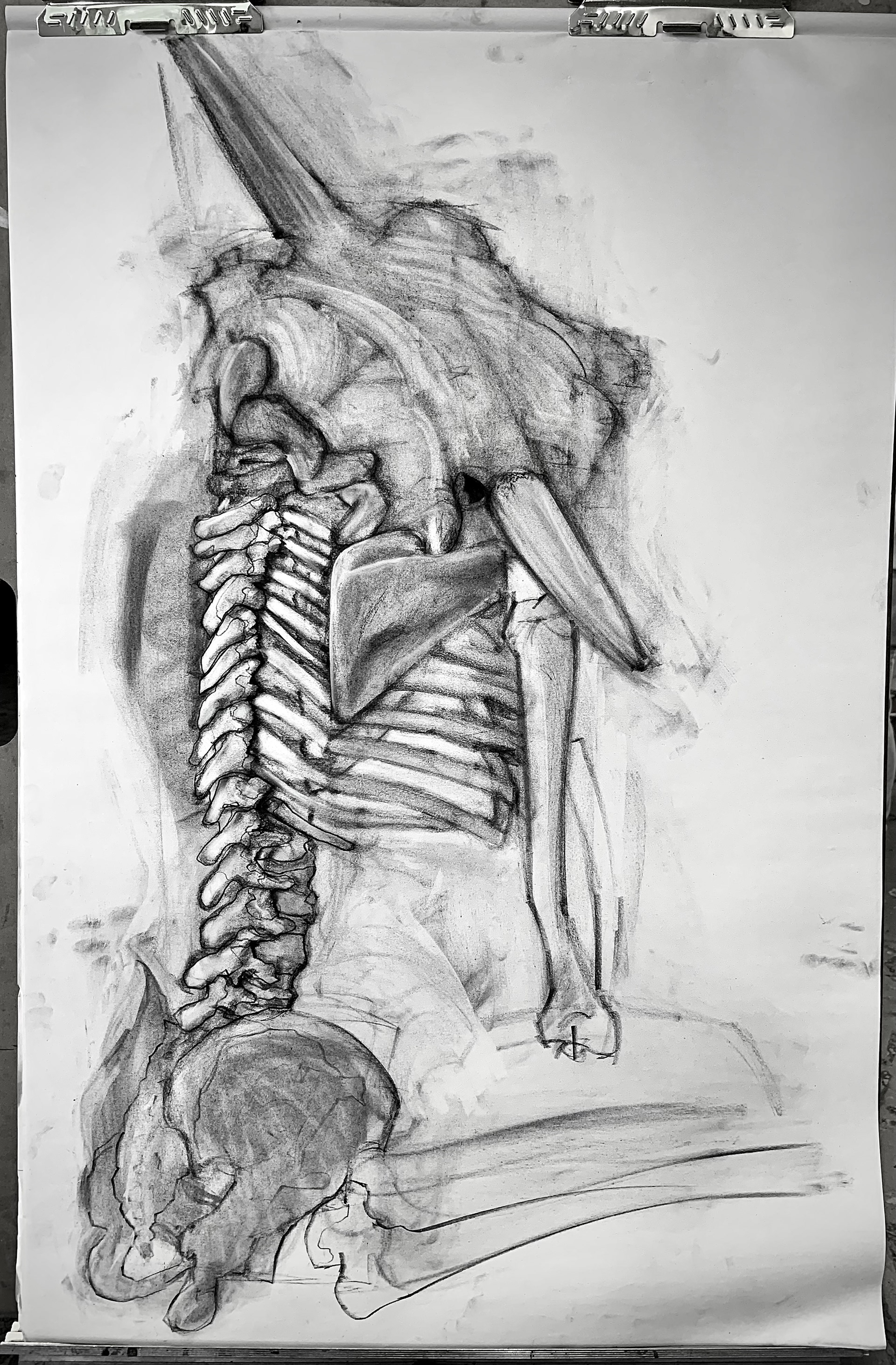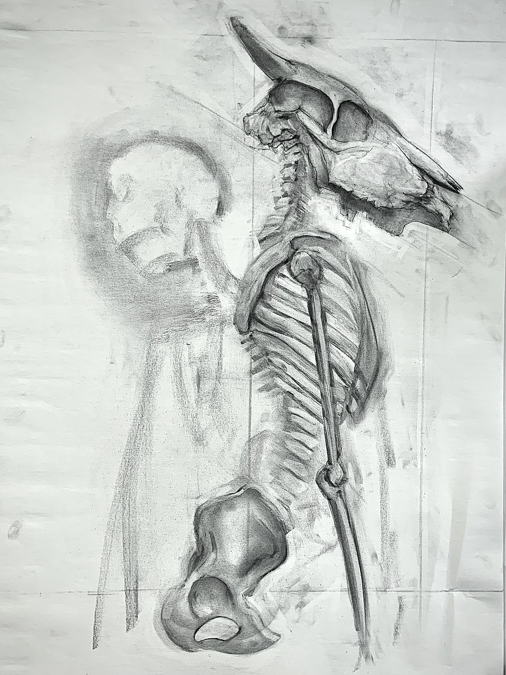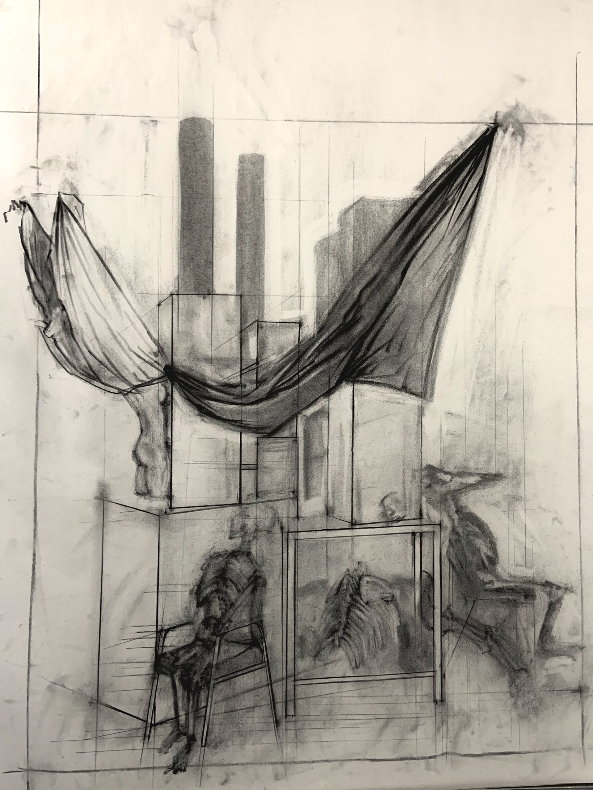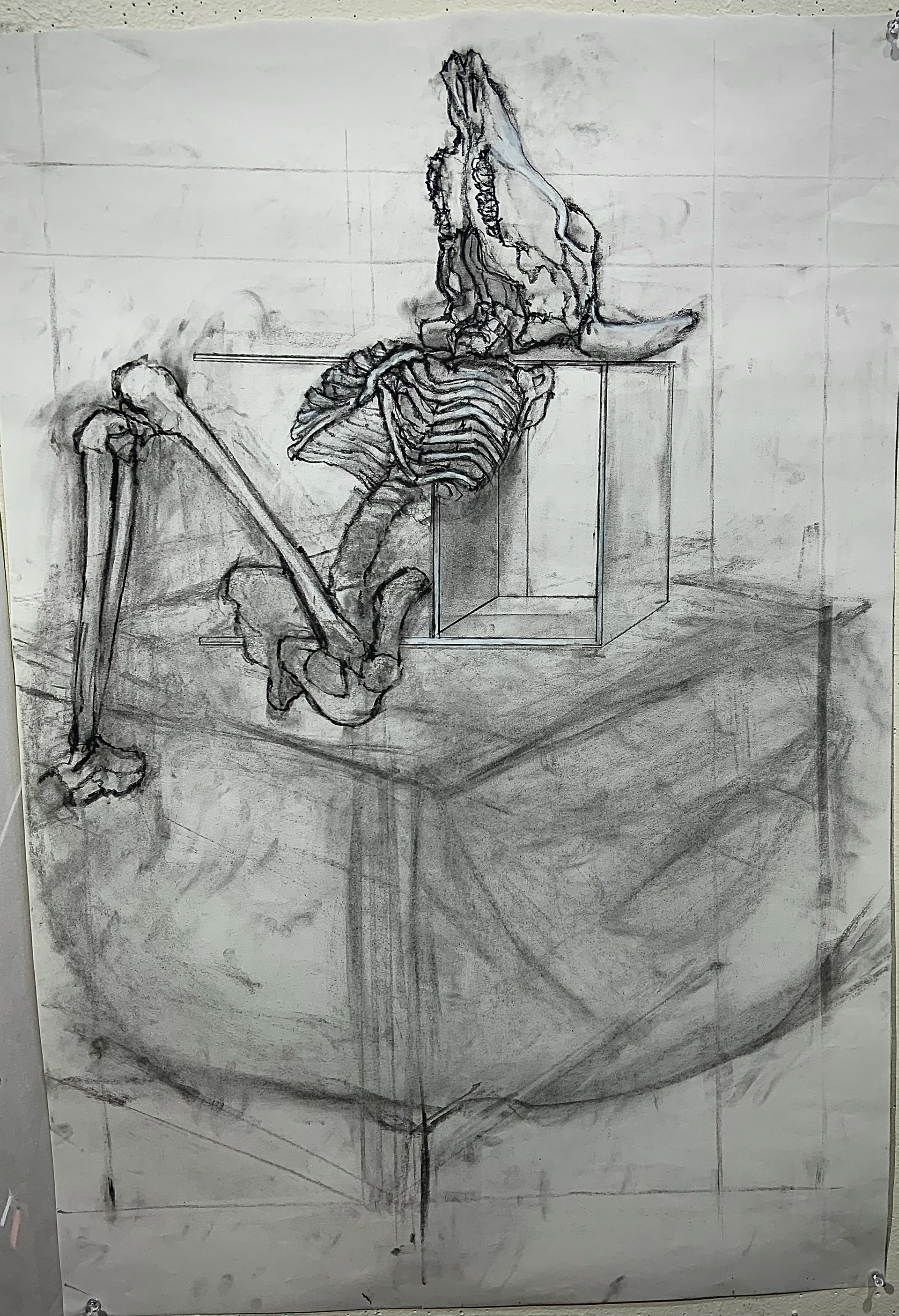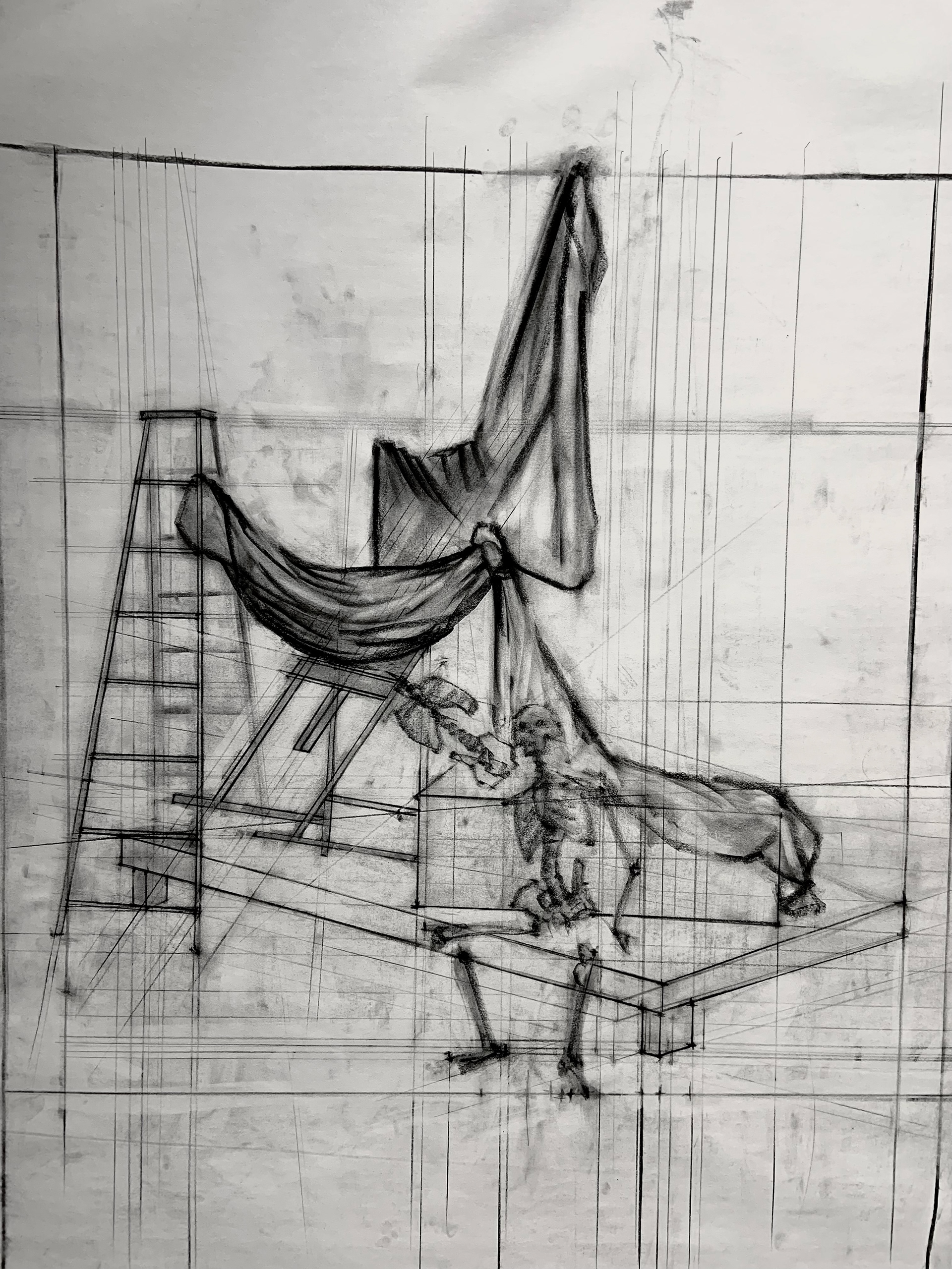 Still-life of skeletal and wooden structures, charcoal on newsprint, sized 18x24